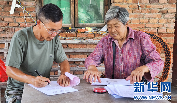 农发猕猴桃公司工作人员与果农(右)签订收购协议。新华网 卢志佳 摄