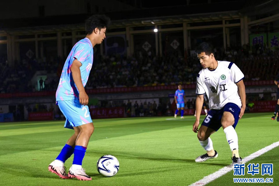9月21日,贵州省铜仁市印江土家族苗族自治县体育场,印江代表队球员(左)在比赛中带球。新华网发(申逸恺 摄)