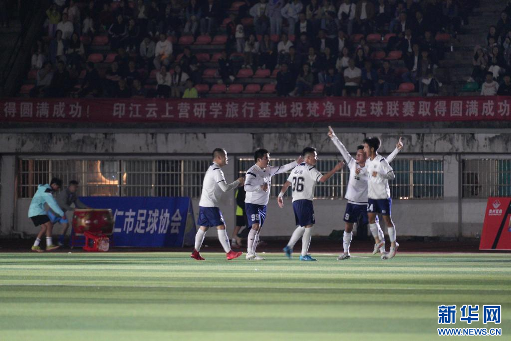 9月21日,贵州省铜仁市梵净山足球联赛揭幕战比赛中,德江代表队球员在进球后欢呼。新华网发(申逸恺 摄)