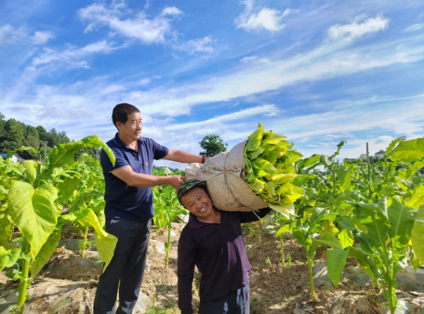 (图为志愿者帮助采摘人员扛上鲜烟叶捆子)