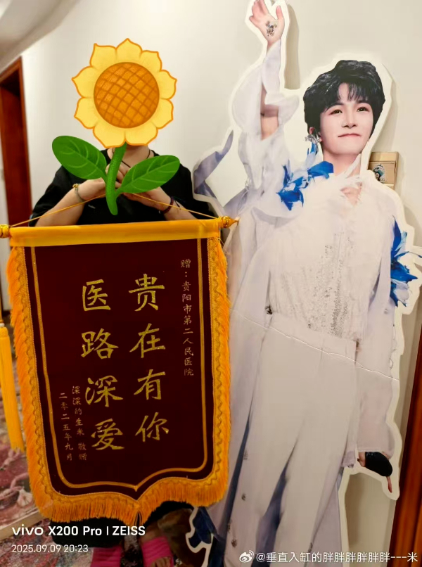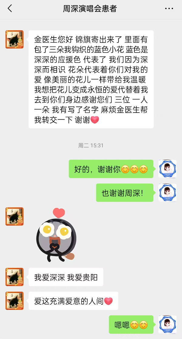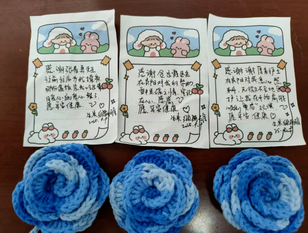 这份突如其来的温暖,让女士久久难忘。事后,她特意带着一面锦旗赶来,鲜红的锦面上“贵在有你,医路深爱”八个字,每一笔都浸满了真心。不仅如此,她还递上三朵亲手编织的蓝色小花——蓝色是周深的应援色,是这场缘分的起点;而花瓣间的褶皱里,藏着的是医护人员给予的暖意,像春日里悄悄绽放的花,温柔又有力量。