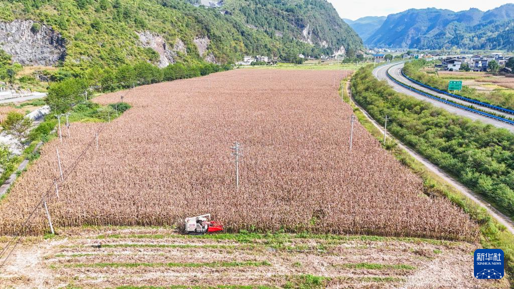 在贵州印江的广袤田野上,大豆玉米带状复合种植基地迎来丰收季。新华社发(王东 摄)