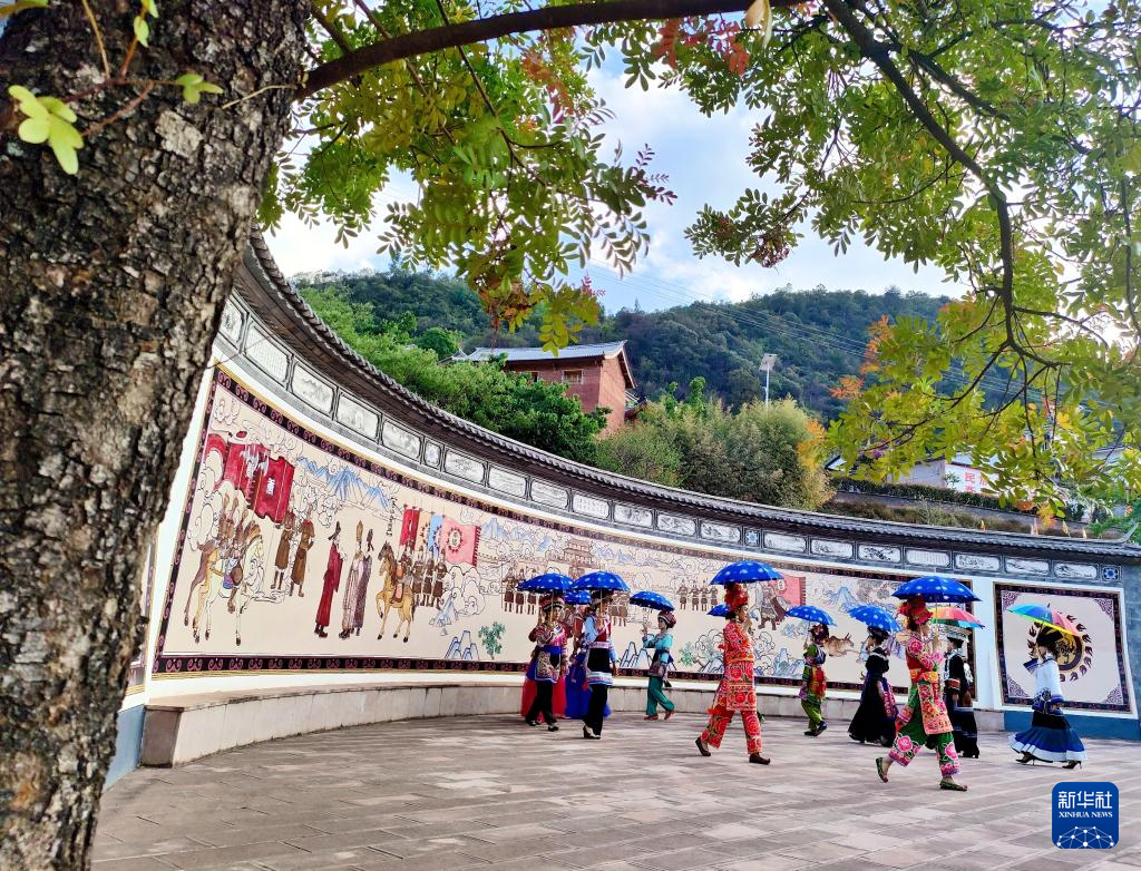 在云南省巍山彝族回族自治县南诏镇新村的活动广场,村民正在排练节目。新华社发