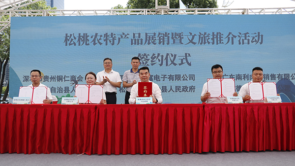 此外,现场还传来合作喜讯,粤黔两地企业达成多项合作共识并完成签约:松桃总工会与虎门组团四镇一区总工会签订职工疗休养合作框架协议,松桃苗族自治县人民政府分别与深圳市贵州铜仁商会、深圳振华富电子有限公司签约,松桃德康农牧有限公司与广东南利肉品销售有限公司签约。