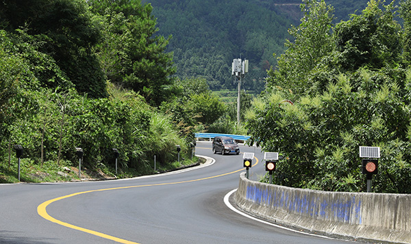 国道352线急弯路段的雨雾警示灯。(杨子依 摄)