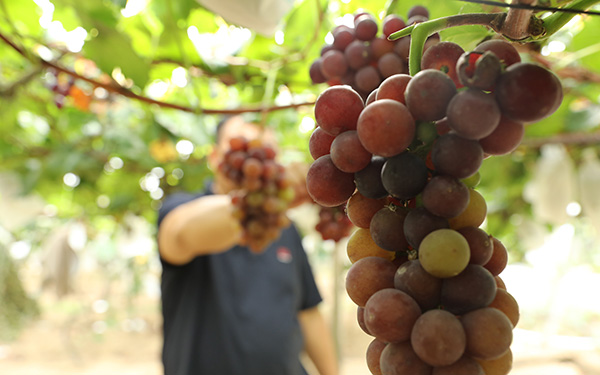 继梅葡萄园内游客体验采摘葡萄。(杨子依 摄)
