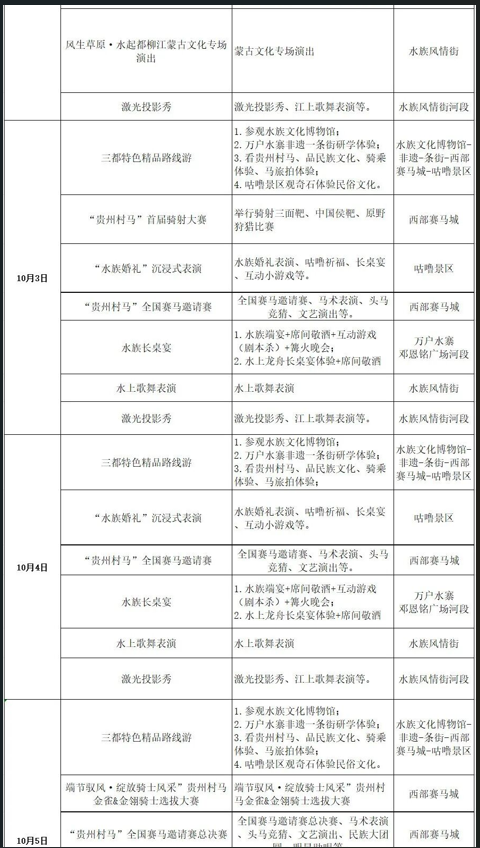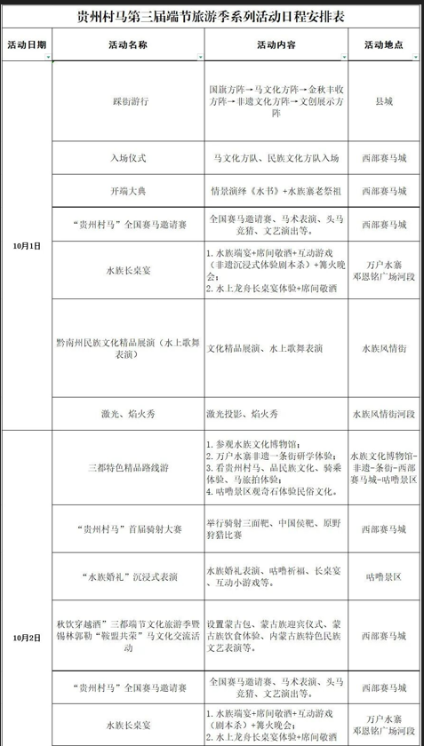 今年时值国庆节、中秋节、端节三节同庆!其中端节盛事承载着水族人民厚重的民族文化和浓郁的民俗风情。从10月1日开始,三都县将在西部赛马城举办开端大典和端节系列活动,主要有:贵州村马全国邀请赛、端节迎宾仪式、祭祖仪式、水族端宴、非遗文化体验等活动,诚邀您走进三都,感受民族文化,体验民族风情!
