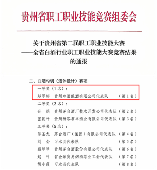 近日,贵州省第二届职工职业技能大赛——全省白酒行业职工职业技能大赛公布品评、勾调、酿造和制曲四大赛项Top20选手榜单。贵州珍酒酿酒有限公司酒体设计师赵翠梅凭借精湛技艺,在竞争激烈的白酒勾调(酒体设计)赛项中脱颖而出,荣获第一名。