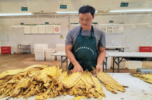 杨军军在分级桌前分烟。(彭小耘 摄)