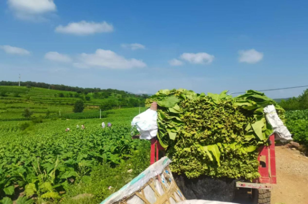 清晨的泥土散发着清香,露水沁润着烟叶,杨军军夫妻俩和请来的10几个工人早早就到了烟田采摘成熟烟叶。你采,我装,他背,一阵忙碌后,拖拉机装满了,随着一阵轰隆声响,一片片承载着希望的绿叶开启了金叶的蜕变之路。