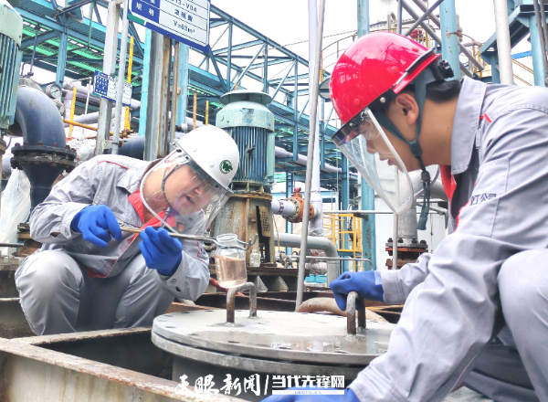 (左一)叶礼在硫酸装置现场查看硫酸成品品质