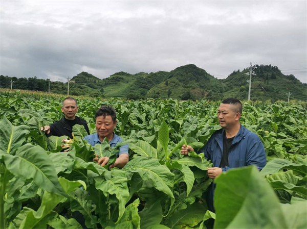 六盘水市局驻村干部、技术员到田间指导杨仁辉种植烤烟。(王铭铧 摄)