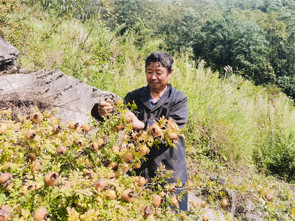 图为杨仁辉在采摘刺梨。(张勇华 摄)