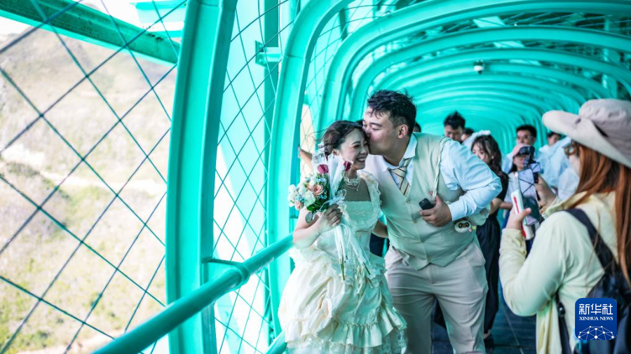 一对新人在贞丰县民政局花江峡谷大桥婚姻登记巡回点登记结婚(9月28日摄)。新华社记者 陶亮 摄