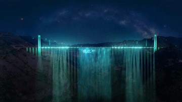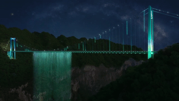 水幕高度随喷射压力可调节至近百米,形成“峡谷IMAX”。水幕灯光秀正式投用后,水、光、声将在此完美结合,达到有品质、有美感、有互动的大桥夜景空间。