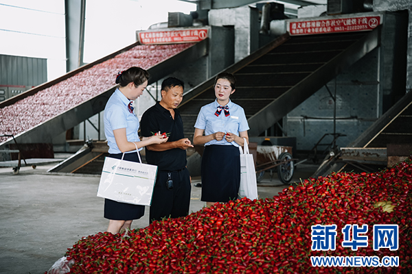 图为邮储银行工作人员走访辣椒企业。新华网发