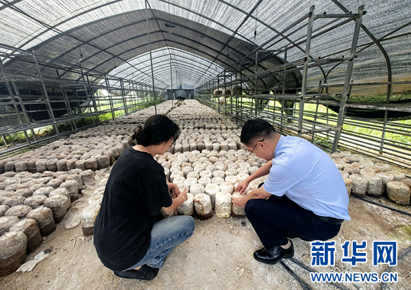 图为邮储银行工作人员走访食用菌基地。新华网发