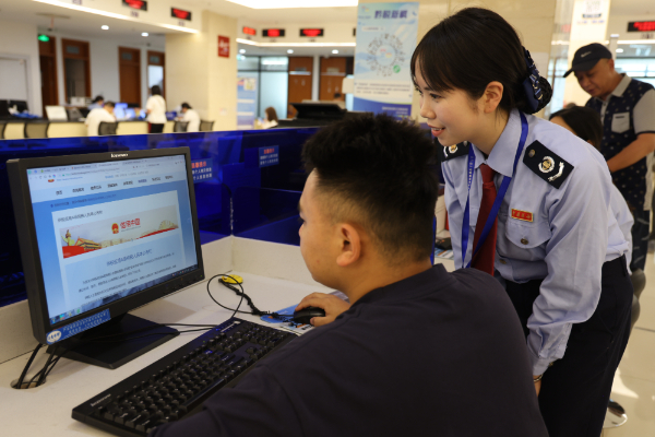 工作人员指导纳税人从电子税务局查询企业纳税信用等级。(漆毓 摄)