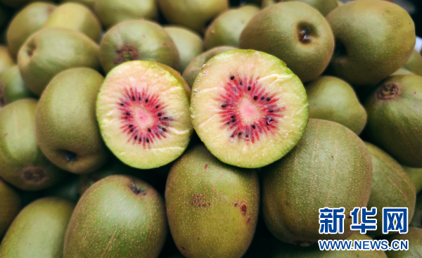 “红心猕猴桃”因果心横截面呈放射状红色条纹而得名(9月9日摄)。新华网 卢志佳 摄