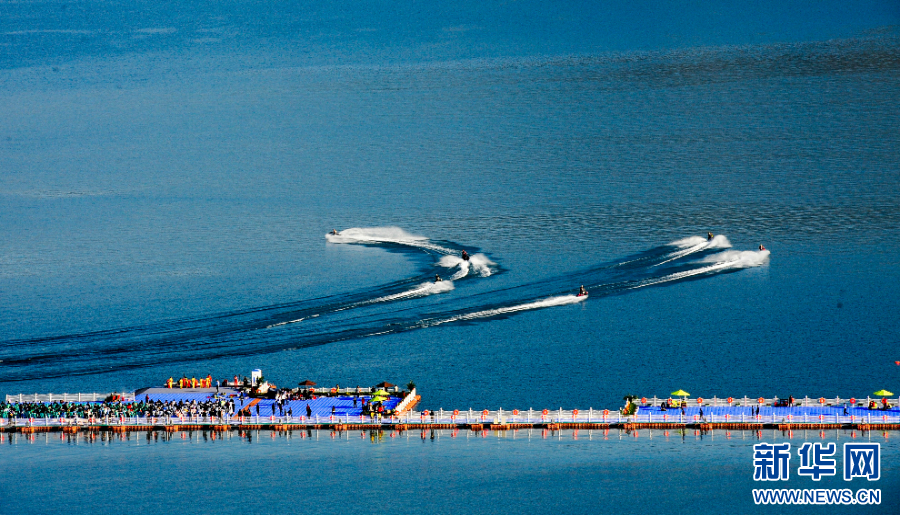 游客在罗甸红水河景区游玩水上项目。新华网发(刘文俊 摄)