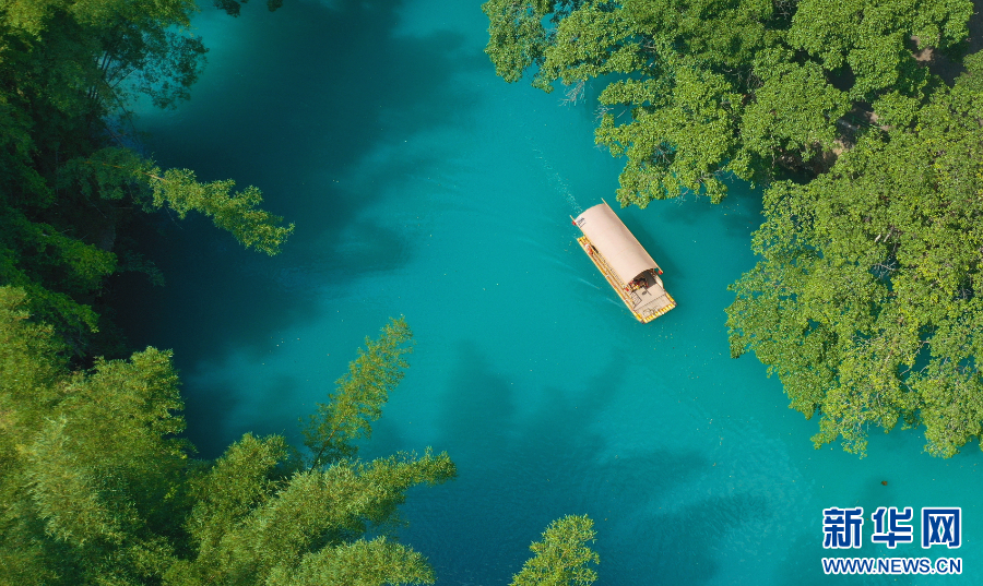 航拍游船穿行在罗甸大小井景区内。新华网 卢志佳 摄