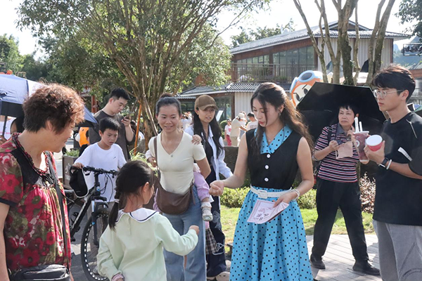 游客与NPC互动搜集“蜂潮粮票”。新华网发(刘佳洛宸 摄)