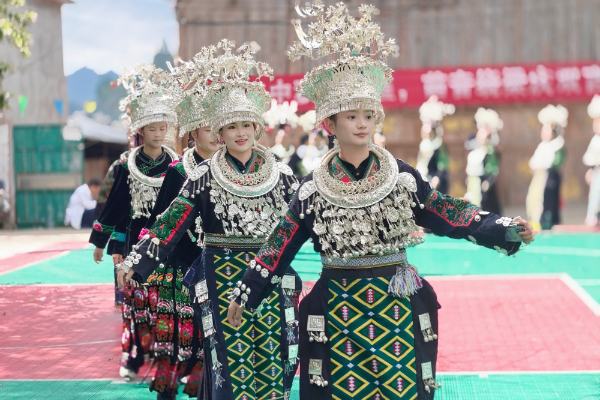 夜幕降临,长桌宴上摆满稻花鱼、疱汤等特色美食,各族群众围坐共餐,举杯同庆丰收年。篝火燃起时,歌声与乐声交织,各族同胞手拉手跳起团圆舞,火光映照下的笑容格外真挚。游客张先生感慨:“沉浸式体验了苗族民俗,更感受到各族一家亲的氛围,这份记忆格外珍贵。”