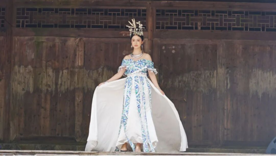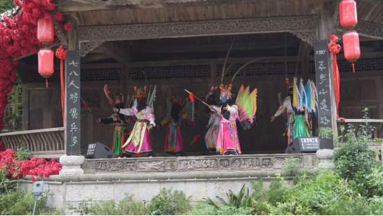 在云峰屯堡景区内的戏台上,“贵州村T”团队及当地民众穿着民族服饰、安顺地戏表演服装、凤阳汉装和带有苗族刺绣、银饰、水族马尾绣等非遗元素的时装新品依次登场展示。