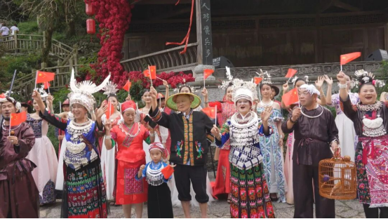 随后,“贵州村T”团队与在场的游客共同挥舞国旗,齐声高唱《我爱你,中国》,将国庆假期氛围推向高潮,点燃爱国情怀。