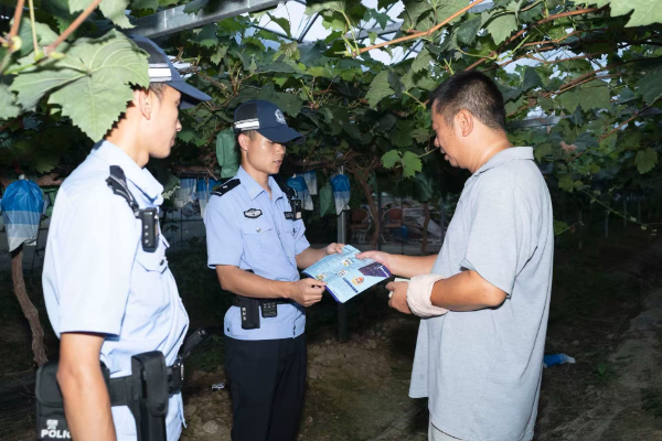 “李哥,您家葡萄装箱后记得锁好棚门,防止被盗……”9月的傍晚,塘边镇葡萄藤下,贵州省平塘县公安局塘边派出所民警拉着果农,宣传安全防范知识和收集工作意见。