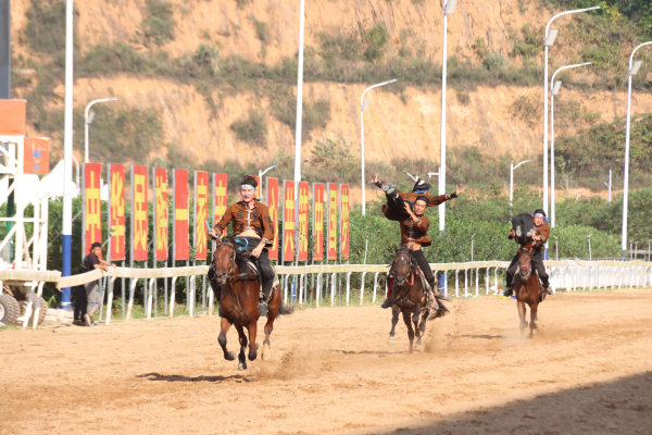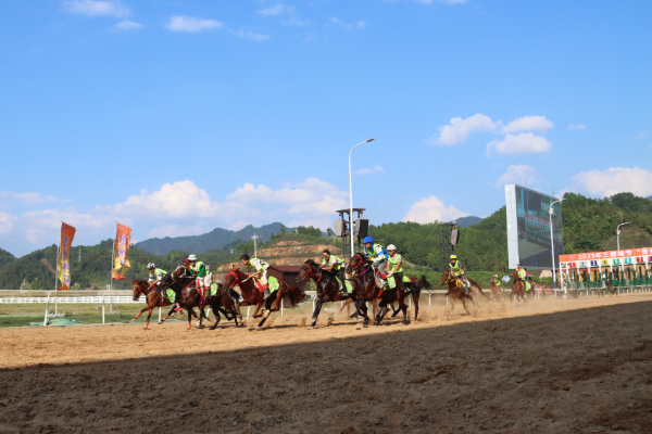 比赛中,骑手们驾驭骏马驰骋,时而并驾齐驱,时而后发赶超,马蹄声与欢呼声交织回荡。赛马间隙,《中华水乡》《苗族舞锦鸡舞》《图腾鸟》等民俗展演轮番上演,6人叠罗汉、马背站立等马术特技更让现场掌声不断。