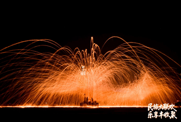 当晚,千年非遗打铁花与现代无人机焰火表演也给观众带来极致的视觉享受。炽热的铁花在夜空中泼洒,如星河坠落;数百架无人机同步升空,编织出民族图腾、丰收稻穗等图案,科技光华与古老铁火交织共鸣,形成“金玉满堂”与“盛世花开”的壮丽图景。