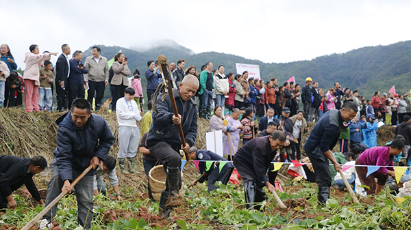 砺山塘志代表队的队员杨华丽分享道:“今天以村为单位,我们参加了挖红薯比赛,现场我们可以看到很多红薯,你看我们挖的红薯这么大,红薯王!能感受到我们从插秧到播薯到收获的整个过程。等一下我们还会套红薯,然后一起品尝红薯制作的美味,一起感受丰收的喜悦。”