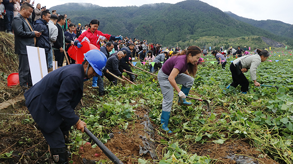 随着哨声响起,活动的重头戏——团队挖薯竞技赛“薯不胜数”正式开始。各队队员迅速投入“战斗”,他们挥锄掘土,分工协作,在田垄间展开速度与技巧的较量,紧张与欢快的气氛弥漫全场。