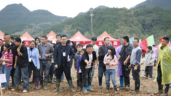 与此同时,“薯书比拼”赛道上的创意角逐同样引人注目。各参赛队以形态各异的红薯为“笔墨”,在田埂上精心拼写出“只要不躺平,薯都能翻身”的励志标语,质朴的食材与巧妙的构思相结合,引来观众阵阵喝彩。而“出圈有薯”套圈比赛则充满了轻松趣味,圆滚滚的红薯成为目标,选手们精准投掷,欢声笑语此起彼伏。