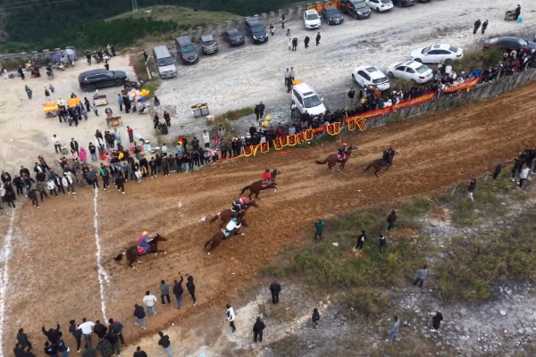当天,大山腰上人潮涌动。水族同胞身着盛装载歌载舞,脸上洋溢着丰收的喜悦,满心期待着赛马的精彩开场。随着裁判一声令下,骑手们驾驭着骏马,如离弦之箭般从山下的起点线飞奔而出,顺着山梁而建的赛道奋勇向前。骑手们不断策马扬鞭,马儿四蹄腾空,奋力驰骋,引得现场观众尖叫声此起彼伏。