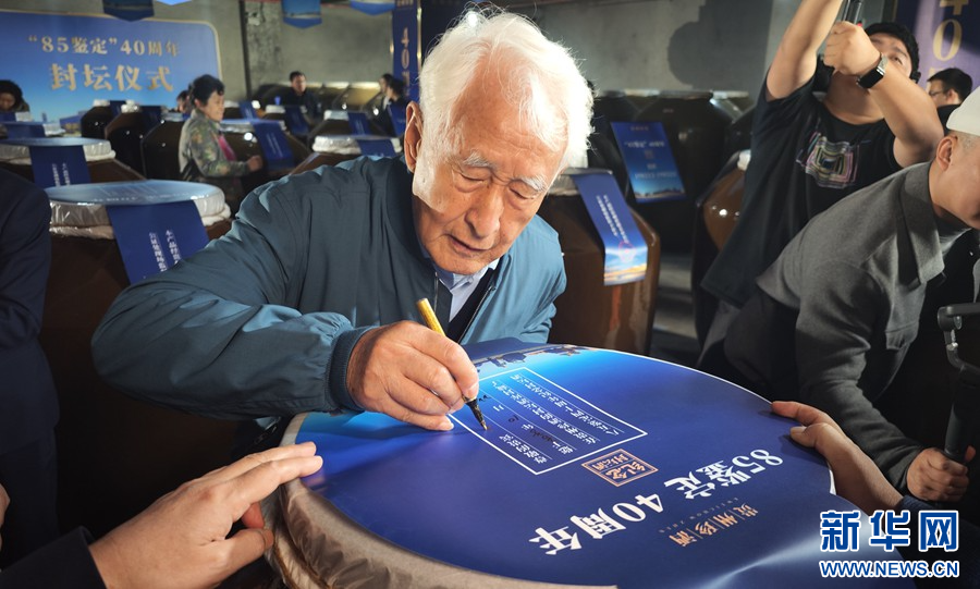 季克良在纪念活动封坛仪式上签名。新华网 卢志佳 摄