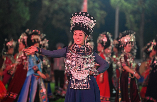 《锦绣苗乡》百人苗族时装秀把展演推向高潮。色彩斑斓苗族服饰上的图案,犹如穿在身上的史书,承载着千年的文化,让观众领略了民族服饰文化魅力。