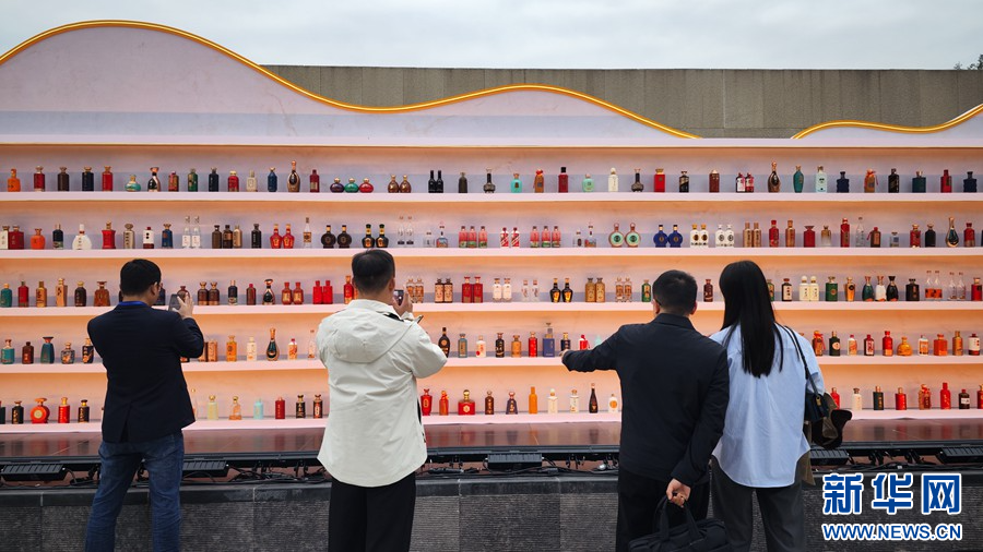 与会嘉宾在开幕式现场设置的遵义白酒展示区参观。新华网 卢志佳 摄