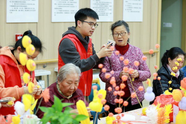 都匀市幸福社区养老服务中心志愿者与老人温馨互动。(肖伟 摄)