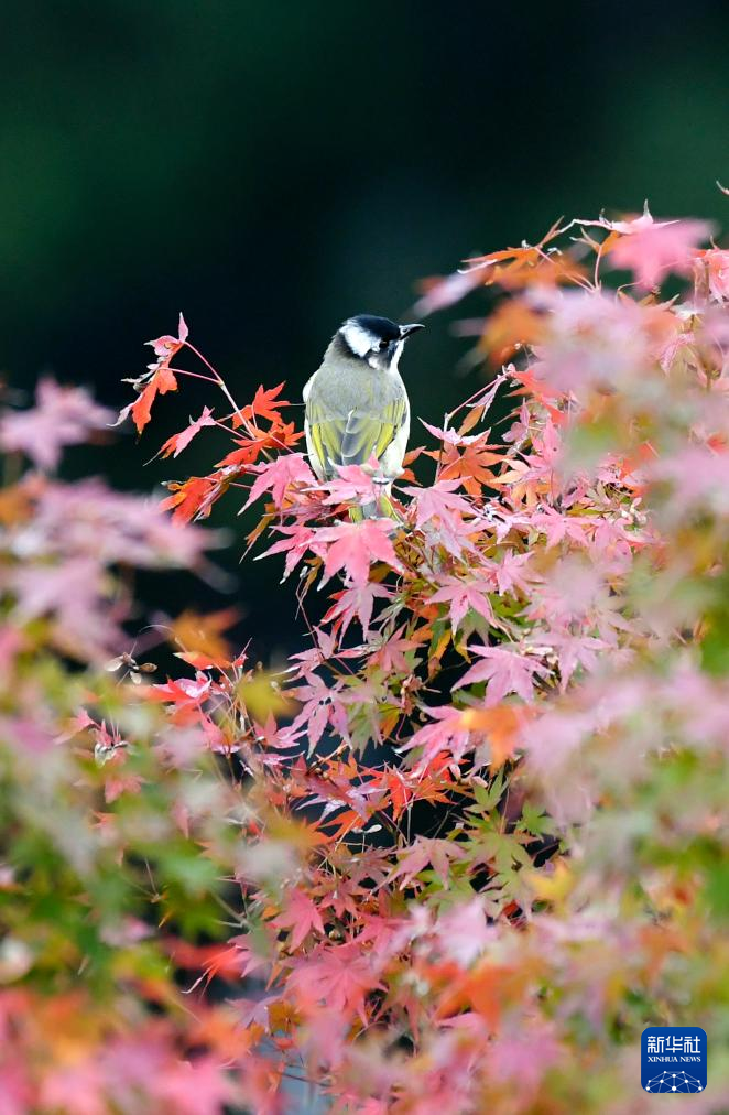11月3日,在贵州省仁怀市楠竹林公园,小鸟在红叶枝头停歇。