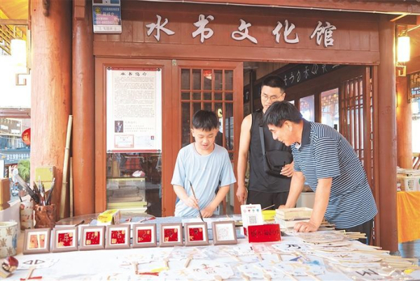 侯圣存(右)指导小游客写水书。