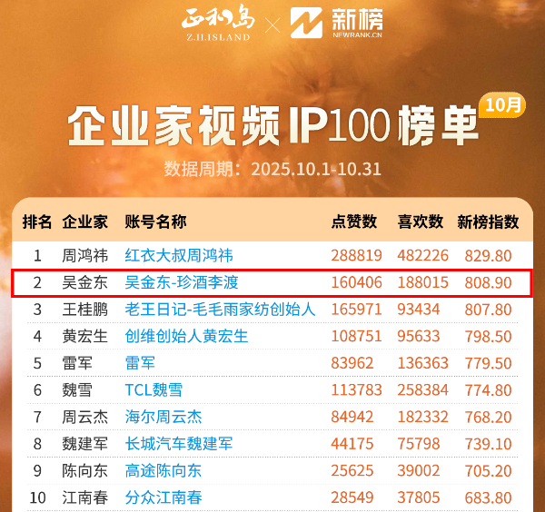 近日,正和岛联合新榜发布《企业家视频IP100榜单(10月)》,珍酒李渡集团董事长吴向东凭借个人视频号“吴金东—珍酒李渡”影响力登榜,位列第二。