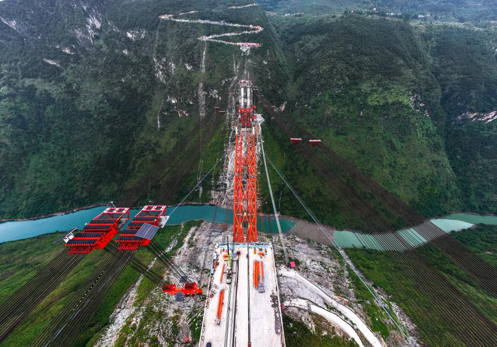 古牛河特大桥是贵州安盘高速控制性工程,全长881.8米,主桥横跨古牛河,主桥桥面到谷底高度约400米。