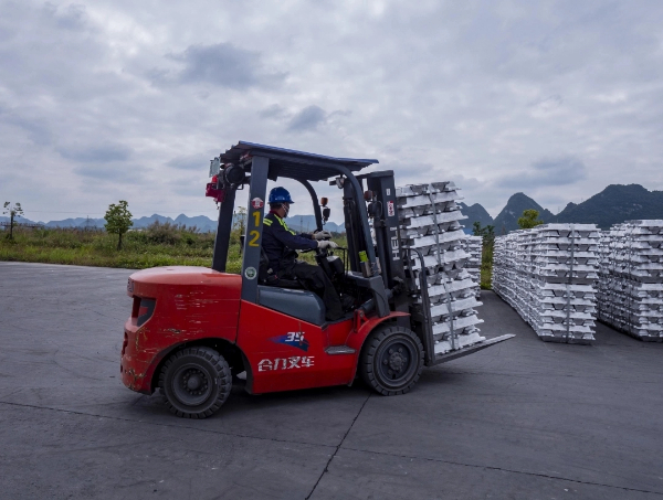 叉车司机正在转运成品的铝锭。贵州日报天眼新闻记者 余军 摄