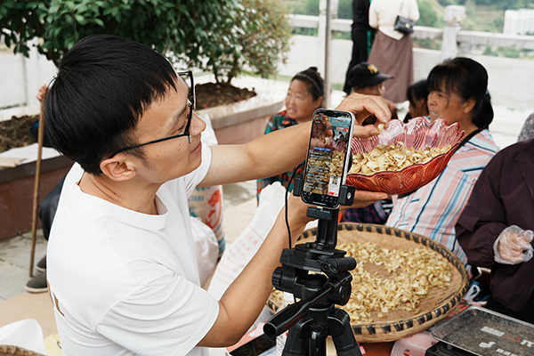 直播间外,农家花生、苦丁茶、黄豆、大米、当归等各类农产品琳琅满目,群众也按序排队,满怀期待地等待着销售。78岁的叶朝明老人小心翼翼地解开口袋,露出里面金灿灿的干花生:“这些都是我亲手种的,往年要背到镇上卖,还不一定能卖出去,现在好了,通过直播能卖个好价钱,并且一次性可以帮我销售完200斤!”他布满皱纹的手轻轻剥着花生,向工作人员展示着成色。