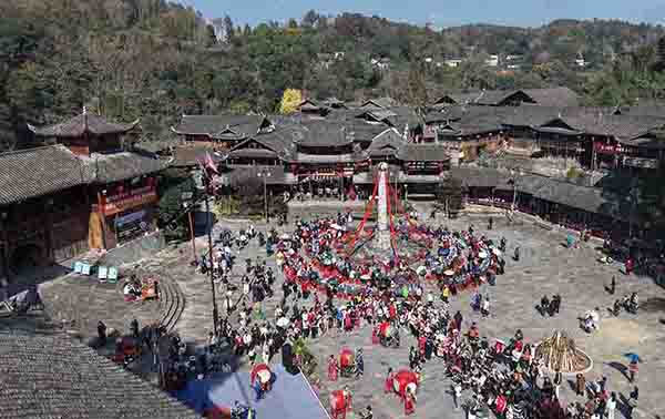11月15日,是一年一度的苗年,当天,松桃苗王城景区内,吊脚楼前挂起红灯笼,石板路上铺满欢声笑语,身着盛装的苗族同胞与来自四面八方的游客欢聚一堂,载歌载舞共庆苗年。