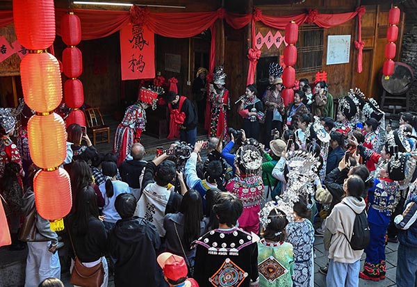 “苗年”是松桃苗族同胞的传统节日,苗语称为“卦吉”,苗家儿女都会聚在一起,唱苗歌、跳舞、打花鼓、吃团圆饭。“苗年”也是苗族一年之中最为重大的节日,是集庆祝收获、祭祀祖宗、感恩天地为一体的隆重节日,苗年期间,将非遗展演、民俗体验、节庆仪式融为一体,让广大游客在沉浸式体验中感受苗乡浓郁年味。(周丽 陈薇 谢慧芳 高风节)