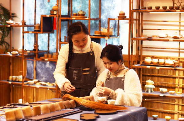 竹是古镇的灵魂,十四届全国人大代表、省级非遗竹编传承人杨昌芹,在极竹堂竹编非遗研学基地授徒,细竹丝经“穿丝、锁边、挑花”古法,转瞬化作纹样精巧的竹灯笼、手提包与竹编山水画。早年,古镇竹编竹篓、竹筐是盐茶运输器具,如今竹编艺人融入现代审美,让老手艺成为“以竹代塑”的时尚工艺品,吸引研学团队与游客争相体验和选购,促进了当地旅游与经济发展。