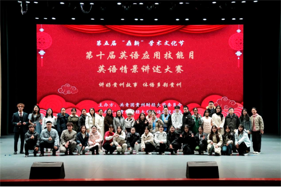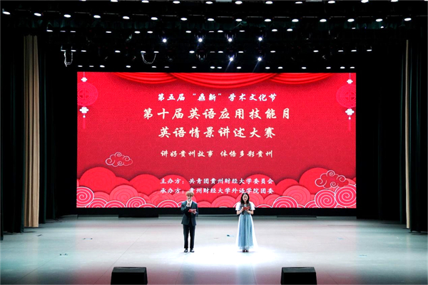 由贵州财经大学学报编辑部、校团委承办、外语学院团委协办的第五届“鼎新”学术文化节之第十届“英语应用技能月”——英语情景讲述大赛决赛于11月18日在学生活动中心大礼堂圆满落幕。本次比赛的主题为:讲好贵州故事,体悟多彩贵州。